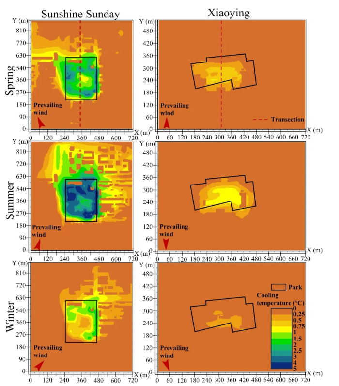 该研究通过季节性逐时的时空演变量化分析,创新性地明晰三维子冷岛效应的多角度动态变化特征,并从三维空间累积角度量化子冷岛所产生的整体潜在能源节约状况。研究工作为遥感学与微气候学融合提供了新的视角,并从三维视角提供了城市公园的多角度评估手段及热缓解策略。