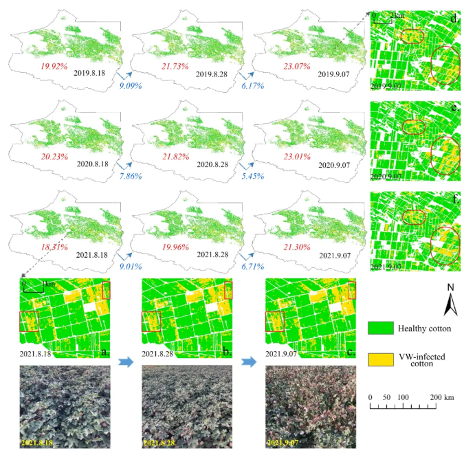 研究团队基于Sentinel-2和Landsat-8卫星数据重构高分辨率时序遥感影像,并采用迁移学习方法准确绘制出2019-2021年北疆棉花主产区黄萎病的时空分布图(图1)。