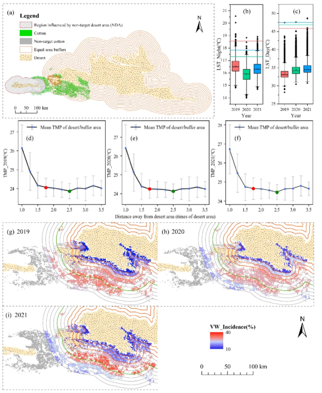 图2 沿古尔班通古特沙漠-绿洲梯度的WEDOF计算和棉花黄萎病发生率的空间格局:(a)表示潜在的背景参考区域,(b)和(c)表示棉花全生育期沙漠和绿洲之间昼夜温差(箱形图显示棉田的LST统计数据,彩色水平线代表各年沙漠的平均LST),(d)-(f)表示沙漠-绿洲TMP梯度的转折点,(g)-(i)表示棉花黄萎病率沿沙漠-绿洲梯度的空间格局