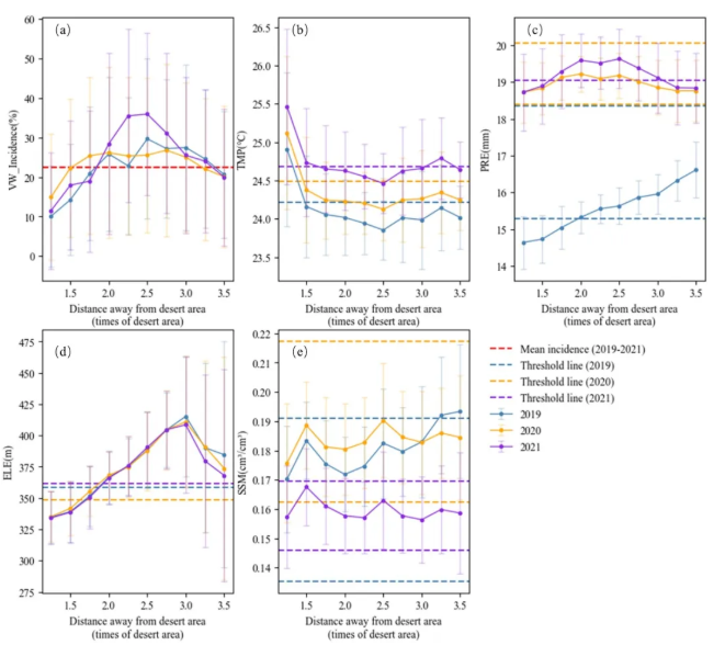 图3 沿古尔班通古特沙漠-绿洲梯度棉花平均黄萎病率和地理环境的空间分布规律:(a)VW-棉花平均黄萎病率、(b) TMP-棉田平均气温、(c)PRE-降水量、(d)ELE-海拔、(e)SSM-土壤湿度