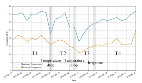 图1 实验期间子时期划分(根据实验期间天气变化及黄萎病发病特点划分子时期T1、T2、T3、T4)